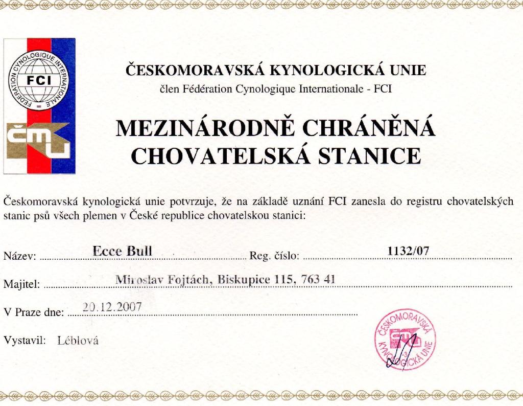 Adresa: Biskupice 115 763 41 Telefon: +420608353049 Zodpovědná osoba: Fojtách Miroslav www: www.eccebull.cz Mail: | Reg. číslo CHS: 1132/07 Certifikát CHS: Zobrazit Certifikát ::: Plánujeme vrh: 01.01.2011 Hodnocení: 90 bodů ze 100 |